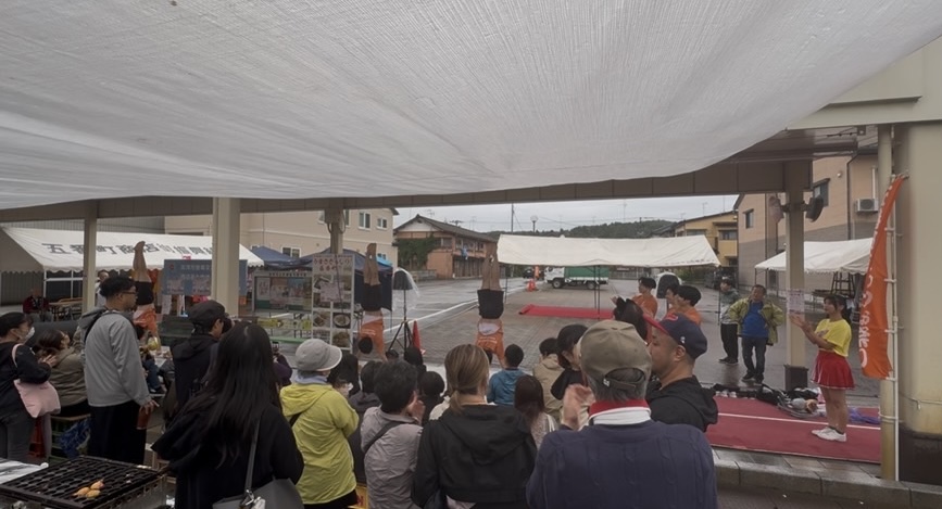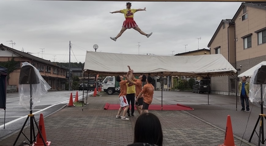10月11日(土)に加茂市五番町商店街でごっつぉ祭りに出演しました。五番町のお祭り参加は今年で3回目となり毎年恒例の行事となっております。今年はあいにくの雨で予定していた演目は披露できませんでしたが、即興で体操競技・チアリーディングの技や動きを披露しました。チアリーディングの学生も協力してくれて初めての合同技にも挑戦しました。