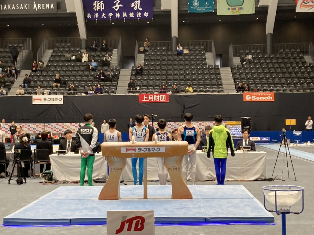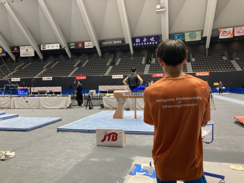 本学学生の鈴木玲偉(スポーツマネジメント学科3年)はあん馬に出場しましたが大技でミスが出てしまい予選31位となってしまいました。今大会で初めて実施する新技に挑戦し、たくさんの関係者に注目されるところまできていたので残念ではありますが来年度に向かっての良い経験となったと思います。