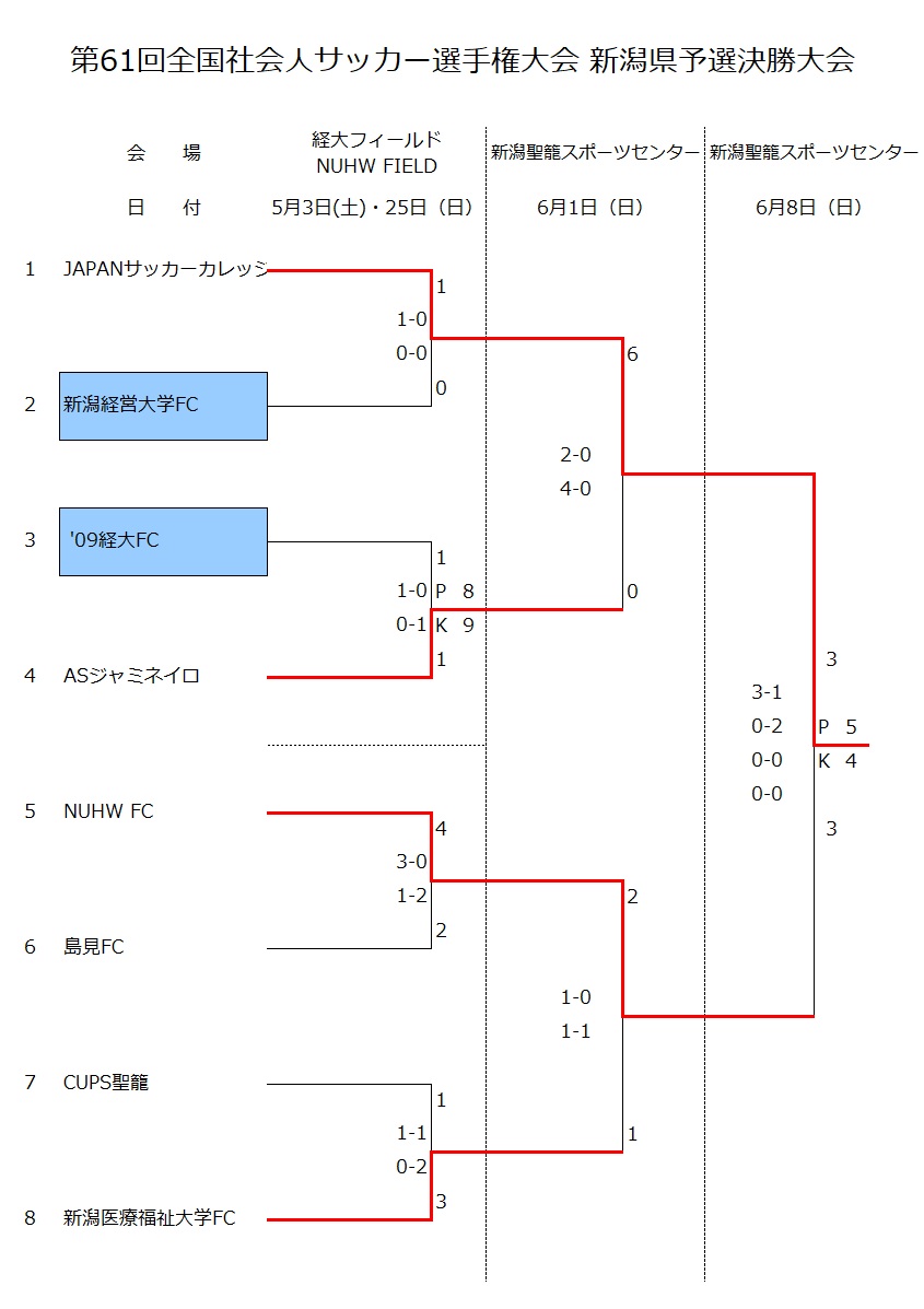 | 準々決勝 | 5月3日(土)13:30 | JAPANサッカーカレッジ | 0 – 1(0-1,0-0) | 新潟経営大学FC | 経大フィールド |