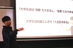 講演の中で並松さんは、大学生活の過ごし方がその後の人生を大きく左右したと自身の経験を語り、後輩に向けて「自分と向き合う時間をつくってほしい」と呼びかけました。