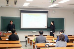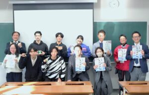中島ゼミによる2025年度「大河津分水魅力発信プロジェクト」活動報告会が、2026年1月7日、本学44講義室にて開催されました。この日は、プロジェクトの協働パートナーである、Love River Net代表、国土交通省北陸地方整備局信濃川河川事務所、燕市地域振興課職員の方々計6名が出席されました。中島ゼミからは、3年次生2名、2年次生3名が登壇し、一年間の成果をふり返り、大河津分水を若年世代にピーアールする仕掛けである、「大河津神社」「カプセルトイ」「タトゥシール」のアップグレード化の提案を発表しました。これを受け、出席者との間で活発な意見交換がなされ、次年度の行動計画に向けての貴重なご助言とご指導を賜りました。