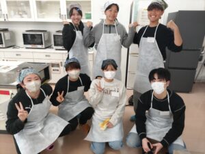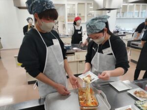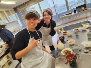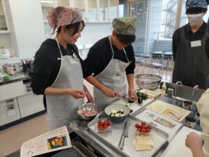 学生たちは、初対面の他大学の学生とも終始和気あいあいと交流しつつ、手際よく調理実習を進めるなど、スポーツを通じて培ったコミュニケーション能力や他者と協働する力をいかんなく発揮していました。