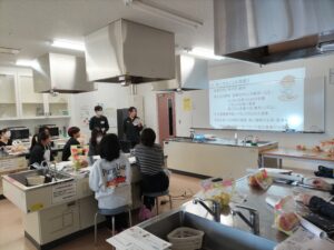 このワークショップは、学生たちが他大学の学生と交流しながら調理実習などを行い、日頃の研究テーマについてお互いに発表し合うことを通じて、改めて食育について考えを深めようという趣旨で、新潟市農林水産部の食と花の推進課が開催したものです。