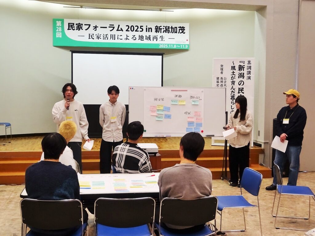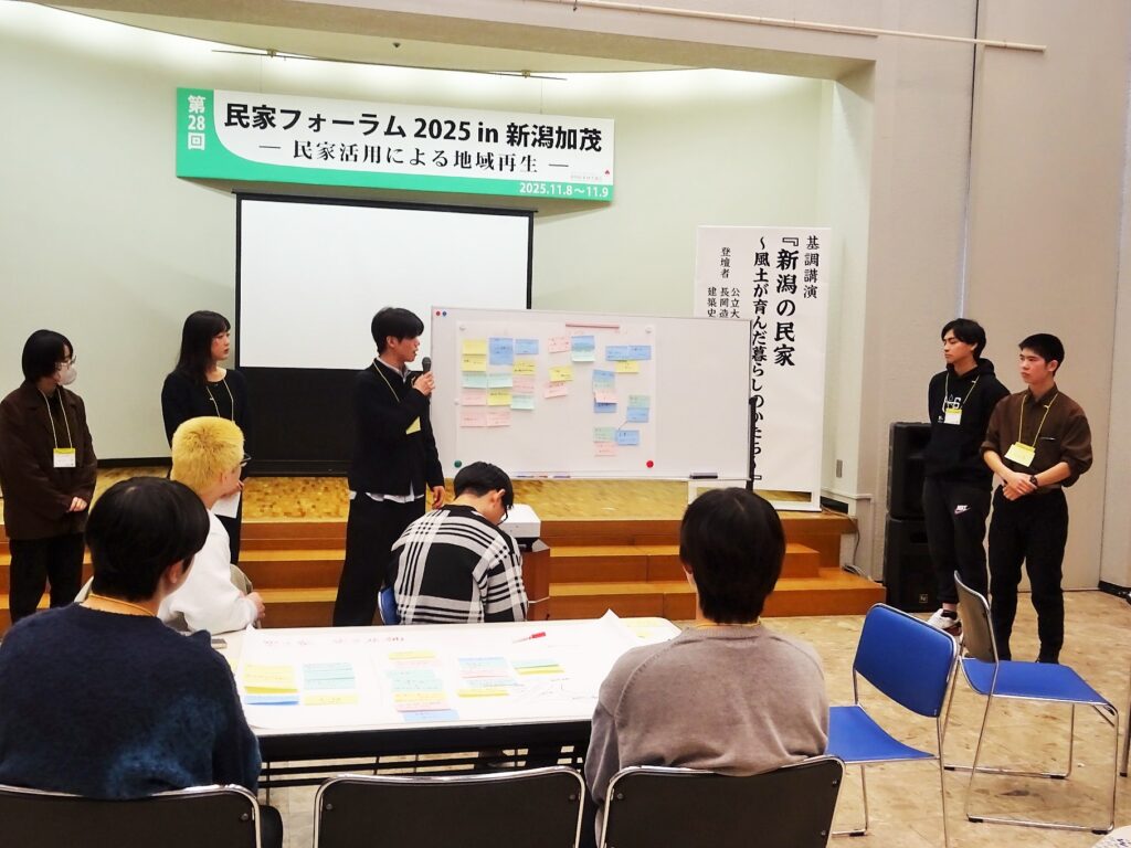 11月8日(土)、加茂文化会館小ホールを会場に「民家フォーラム2025 in 新潟加茂~民家活用による地域再生~」(主催:特定非営利活動法人民家再生協会)が開催され、午前のプログラムで大学生によるテーブルセッションがおこなわれました。これに新潟大学岡崎ゼミ、長岡造形大学木村ゼミ、新潟経営大学中島ゼミの学生が参加し、「加茂の伝統、文化を未来につなげるには?」をテーマに意見交換がなされました。