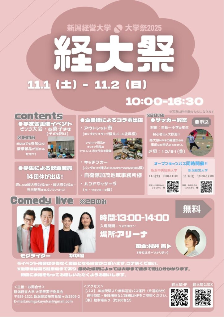 豪華ゲストによるお笑いライブ、学生による屋台・イベントなど、